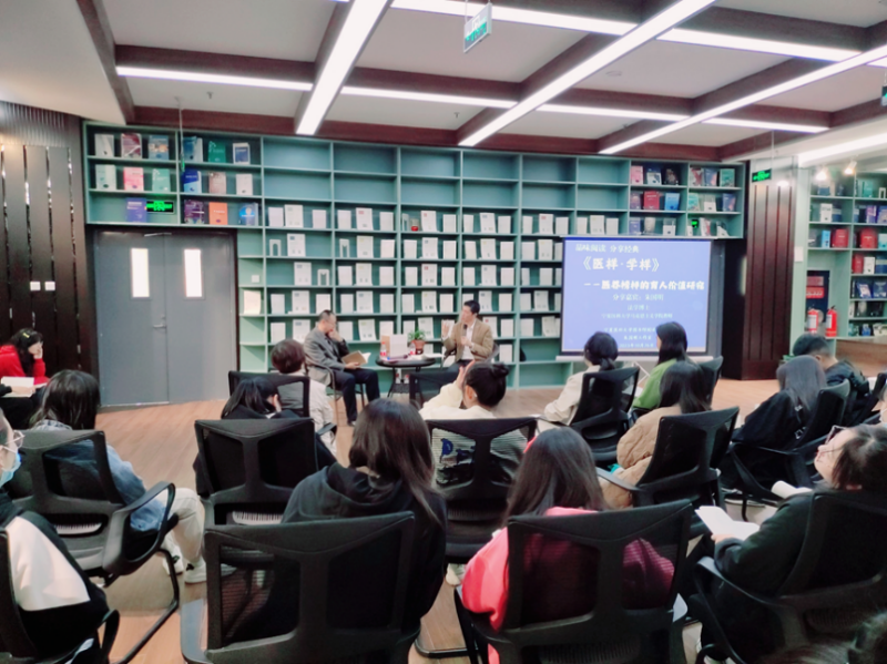 读书会交流过程中,朱国明老师分享了个人新出版的著作《医样·学样—医界榜样的育人价值研究》写作目的和感受,并鼓励同学们积极了解张仲景、张孝骞、钟南山等我国医药界先进人物的事迹,学习他们优秀品质和奉献精神,不断增强文化自信和对医学事业的的热爱,力争做一名“敬佑生命、救死扶伤、甘于奉献、大爱无疆”的优秀医务工作者。朱国明老师还从个人经历和思政课教师的角度与学生们一起交流探讨了职业选择、人生追求、人际交往等方面的问题。工作室成员马红艳老师结合自己的学习和教学经验,鼓励青年学生们多读书、多思考,提升人文素养,为健康中国建设奉献自己的力量。交流活动结束后,朱国明老师为图书馆和现场同学签名赠书。(朱国明 徐海霞/文 徐海霞 王浩/图)