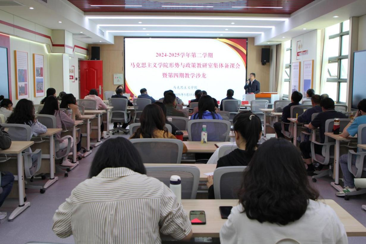 5月15日上午,马克思主义学院在应谦教学楼思政VR教学体验中心召开“形势与政策”课集体备课会暨第四期教学沙龙。本次会议聚焦中美关系新动向,通过专家辅导、教学研讨等环节,推动最新时政热点有机融入课堂教学。学院党政领导班子、全体专兼职教师及辅导员代表等50余人参会。