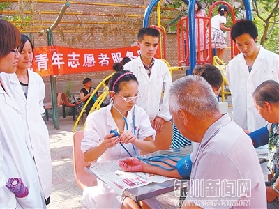 大学生志愿者利用所学的专业知识,正在文化园社区开展义诊服务活动。