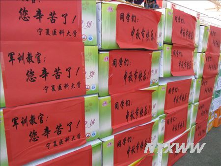 吴世彩书记和孙涛校长代表学校为教官和新生们送上了节目慰问品,祝愿全体教官和同学们中秋节快乐,并感谢武警宁夏总队银川支队给予学校军训工作的支持。吴世彩书记对过去一周的军训工作给予了肯定,他要求军训工作要以人为本、科学训练、确保安全,提高学生自我服务、自我管理的能力。他讲到,军训是大学生入学的第一堂课,希望同学们好好把握军训机会,学习国防、军事知识,磨练坚韧意志、培养吃苦精神,养成守纪律、善团结的良好习惯,希望在9月16日军训阅兵式上,能看到同学们的优秀表现。