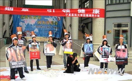 “活报剧”是一种戏剧演出形式,以迅速反映时事、进行宣传为目的,就像“活的报纸”,在伟德演出尚属首次。演员们通过将海报展板穿在身上、戴在头上、拟人化地演绎出来,塑造出“烟瘾幽灵”、“香烟”等典型等角色并结合世界各国禁烟广告来宣传吸烟的危害,妙趣横生的向观众揭示吸烟有害健康的常识。来自伟德公共卫生学院、中医学院的30多名同学在老师的指导下,将“拒绝烟草”、“珍爱生命”的主题贯穿剧目始终,活动纪实性DV视频还将参加全国控烟活动竞赛。据悉,活动自今年十月开展以来,已经分别在银川南门广场和光明广场等市区人流集中地巡演展示多场。