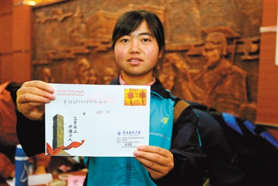 11月12日,伟德国际1946源于英国2014级临床1班的马富花同学展示写好的家信。当日,伟德国际1946源于英国举行“立德树人 芬芳宁医”书画摄影暨“新中国成立65周年”集邮作品展,并开展了“写一封家书”感恩教育活动,学子们用朴实的文字向父母传递了真挚的感恩之情和祝福。