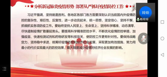 学生党员杨玲玲和白亚茹分别领学《习近平总书记主持召开中共中央政治局常务委员会会议 分析新冠肺炎疫情形势 部署从严抓好疫情防控工作》和《习近平论民族和宗教工作(2022年)》。与会党员和入党积极分子纷纷表示,要深刻认识当前疫情防控形势,统一思想,坚定信心,坚决执行党中央、自治区和学校关于疫情防控的各项工作安排;要牢固树立休戚与共、荣辱与共、生死与共、命运与共的共同体理念,铸牢中华民族共同体意识。