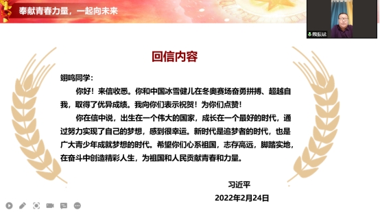 魏振斌希望支部师生切实把思想和行动统一到深入学习贯彻习近平总书记给中国冰雪健儿重要回信精神上来,坚持体育育人,弘扬中华体育精神,德智体美劳全面发展;崇廉尚洁,加强支部廉政文化建设,做诚实守信的新时代青年。