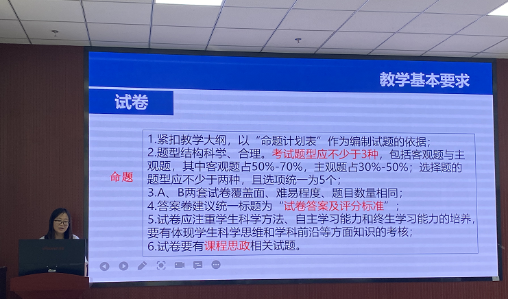 学院副书记钱月慧结合学校教学检查意见反馈,从院级质控管理、集体备课、试讲、教案、试卷、相关课程过程性评价、实验报告、随机听课等几方面进行详细反馈,要求学院教师继续保持优点,针对不足之处严格按照标准进行整改落实。她强调,本学期临近期末,相关课程负责人要以此次教学检查反馈的问题进行整改,做好期末考试命题、监考等相关工作,保证考务工作正常运行。会议最后,学院教学管理办公室主任夏继凤针对教学基本规范要求对授课教师进行培训,尤其从教案的书写规范和试卷的命题、批阅、装订等方面再次强调了规范性。