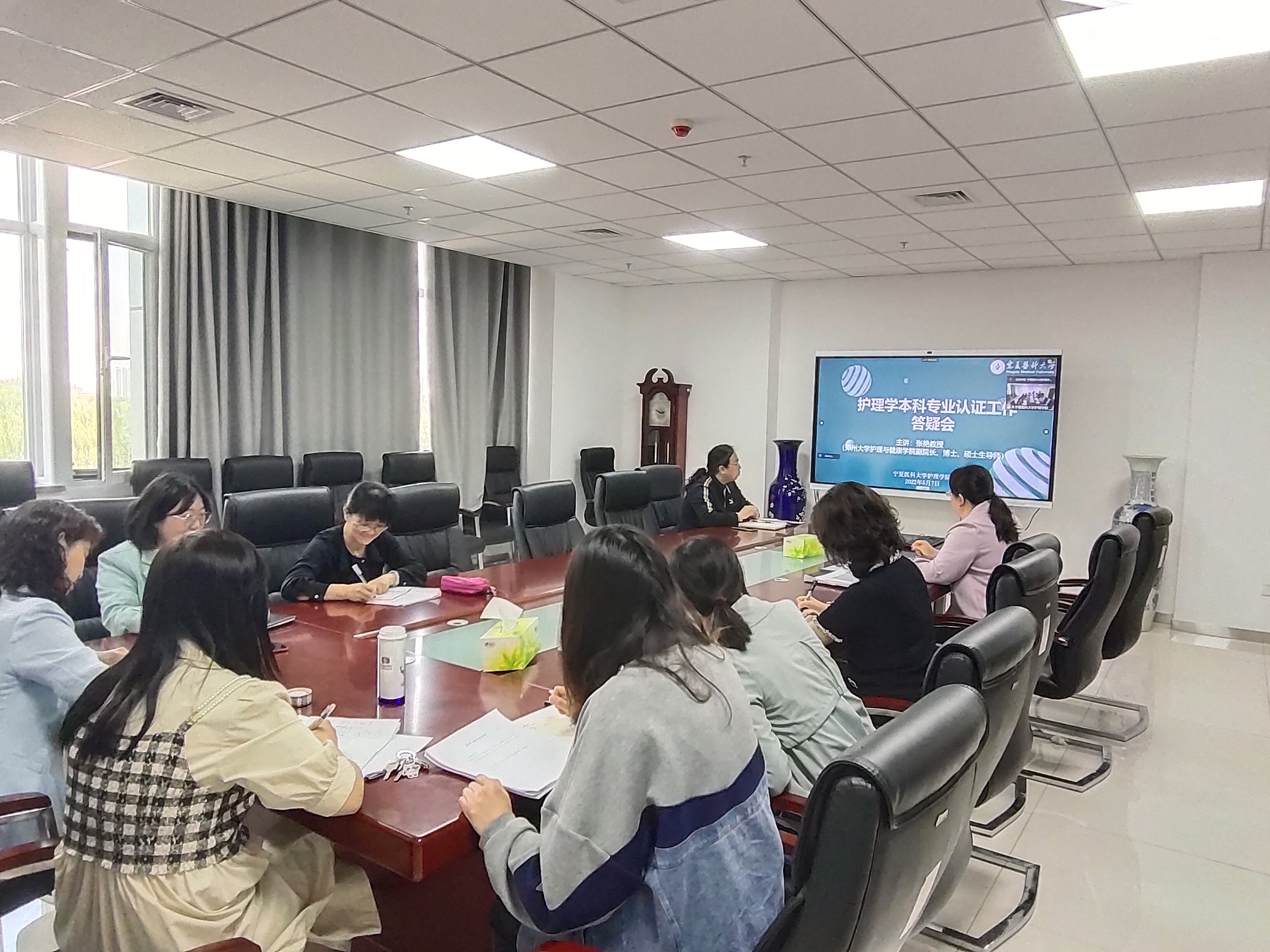 5月7日上午9点,护理学院护理学专业认证答疑会在知行楼605会议室举行。会议由护理学院副院长李兆君主持,特邀请郑州大学护理学院院长张艳教授通过腾讯会议线上答疑,学院各认证组组长、认证办相关人员参加会议。