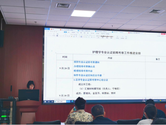 宁艳花副院长介绍了护理学专业认证前期考察工作推进安排。一是成立分工组,要求学院全体教职工密切配合,切实做好迎接护理学专业认证的各项准备工作;二是要求紧扣指标体系,做好支撑材料、汇报材料的准备工作。三是明确学生应知应会培训及学生座谈会任务。