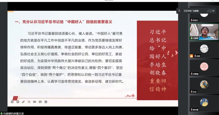 马睿婕领学《深入学习宣传贯彻习近平总书记给“中国好人” 李培生、胡晓春重要回信精神》,她从回信背景、回信全文解读、回信精神三方面讲解了信件。全体党员及积极分子都认为,我们应该从身边做起、从小事做起,在执着坚守中迸发出耀眼的道德光芒;大力营造学习好人、向上向善的浓厚氛围,激励和引导更多人传播真善美、传递正能量。