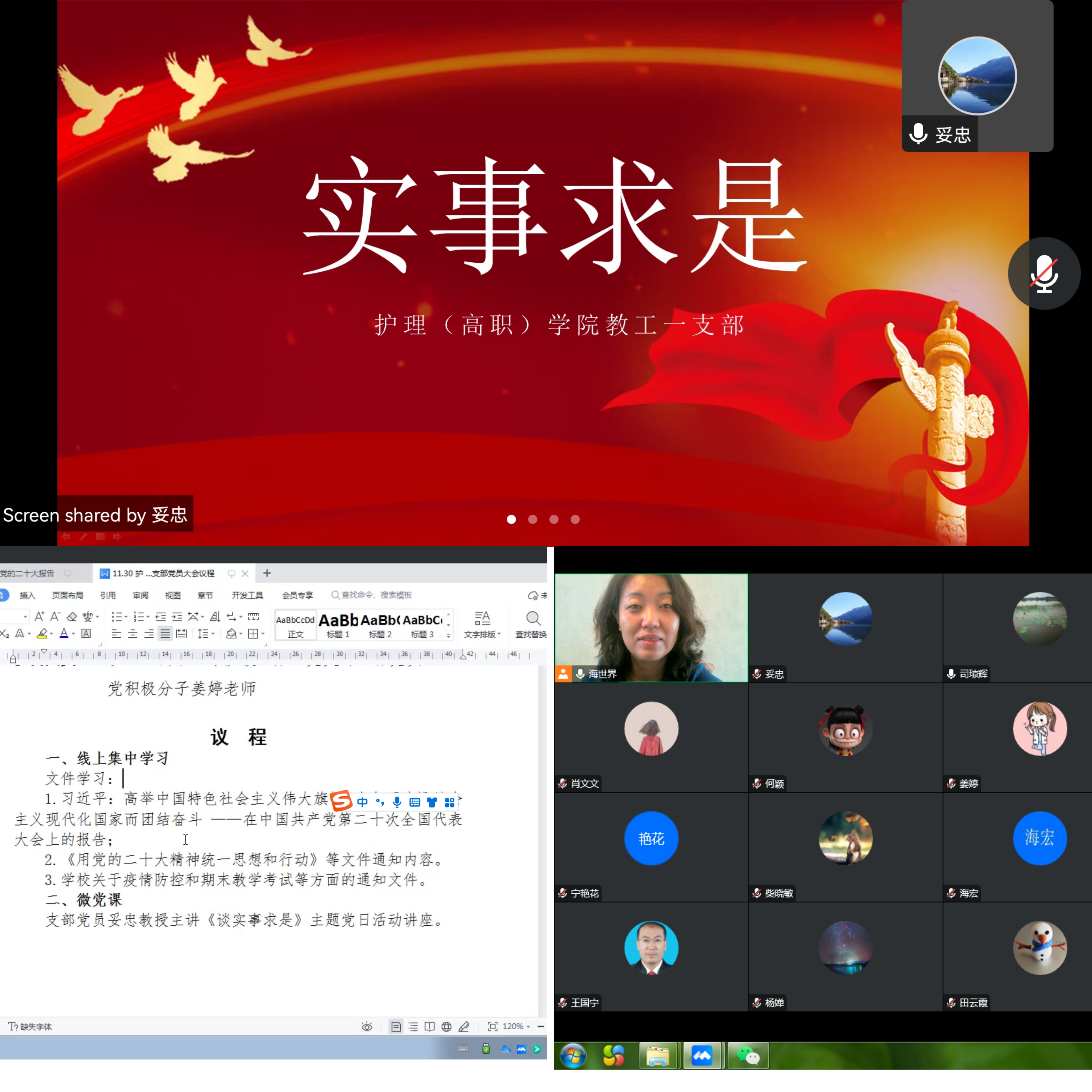 2022年11月30日9时,护理(高职)学院教工第一党支部全体党员连线腾讯视频会议开展了党的二十大精神宣讲学习和微党课“实事求是”主题党日活动,会议由支部书记朴海善主持,支部全体党员和一名教师入党积极分子参会。