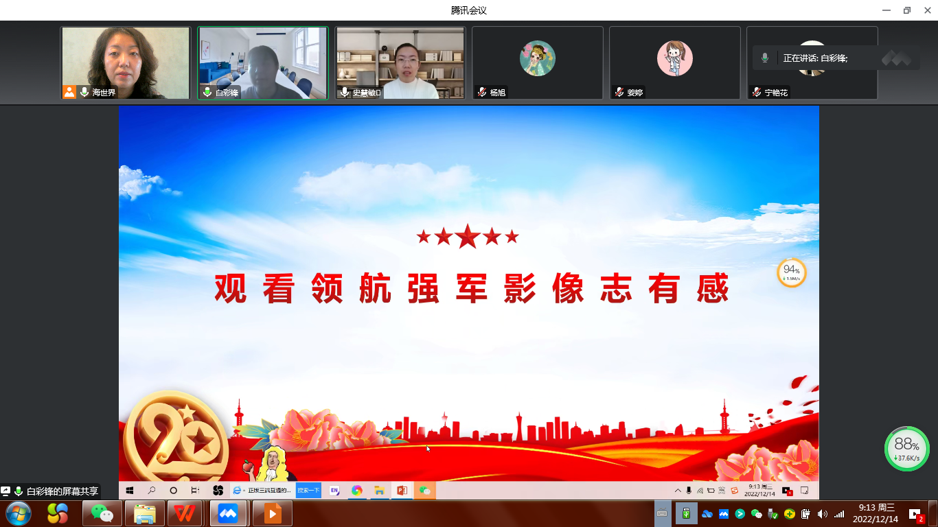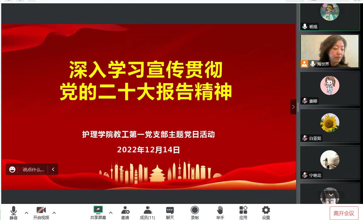 2022年12月14日9:00,护理(高职)学院教工第一党支部全体党员连线腾讯视频线上会议开展了主题党日学习活动,会议由支部书记朴海善主持,支部全体党员和入党积极分子参加。