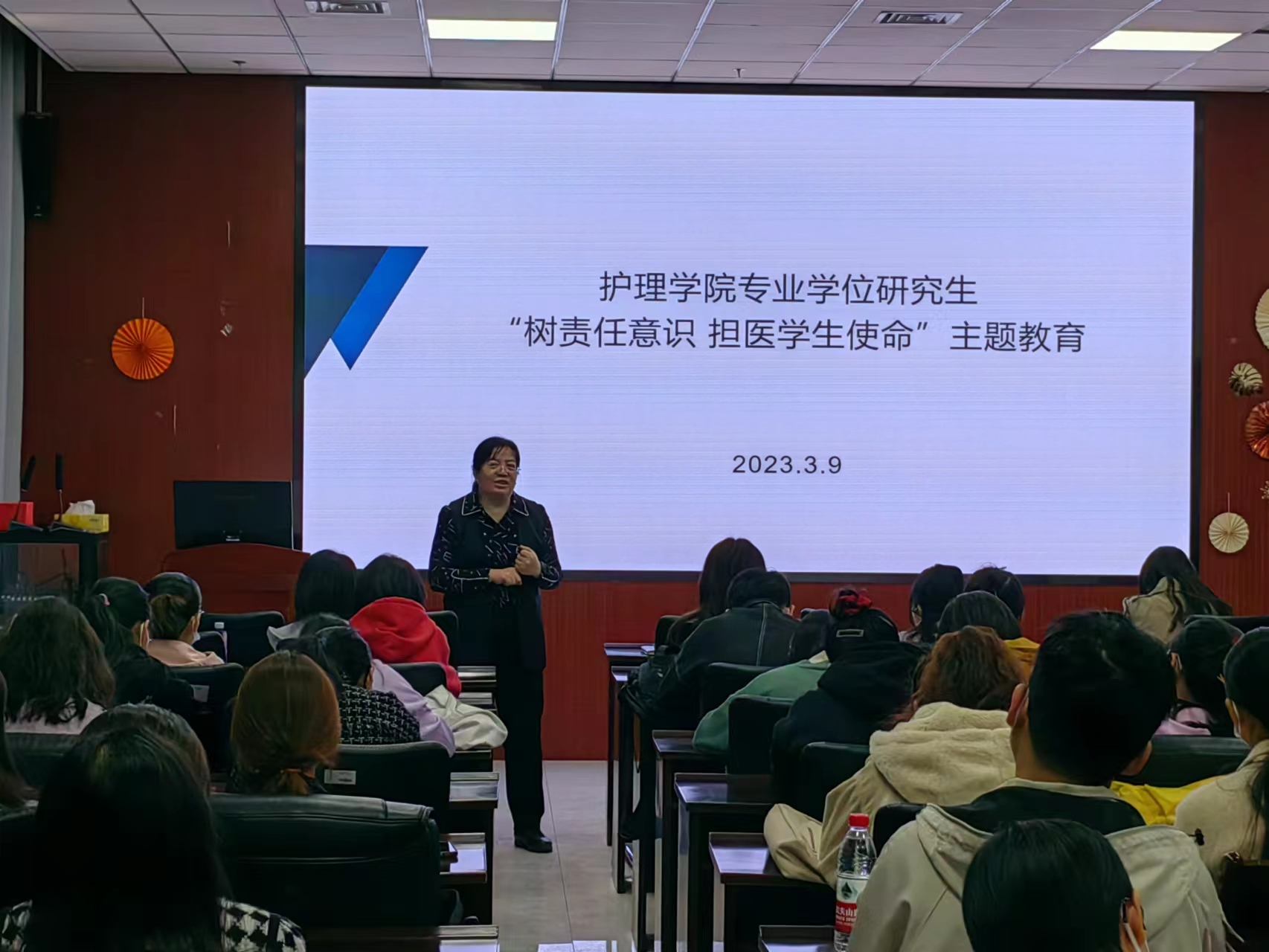 3月9日上午,护理学院开展“树责任意识 担医学生使命”主题教育专题讲座。学院党委书记司琼辉、副院长李兆君、研究生辅导员和全体专业学位研究生参加。