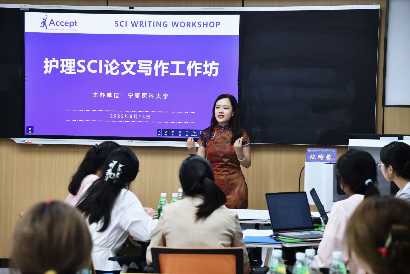 论坛结束后,围绕“学术筑基:学术论文写作与干预研究实践”,陈琦蓉教授和黄重梅教授开展了护理SCI论文写作工作坊,详细讲解了护理SCI论文写作的关键步骤,包括选题策略、研究设计、数据分析、撰写技巧以及投稿注意事项等。肖锦南教授和陈佳睿教授开展了行为干预、实施与评价工作坊,聚焦于行为干预的理论框架与实践应用,深入探讨了如何科学设计干预方案、选择合适的评估工具以及有效实施干预措施。两场工作坊内容充实,为参会人员提供了宝贵的指导和启发。