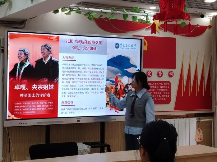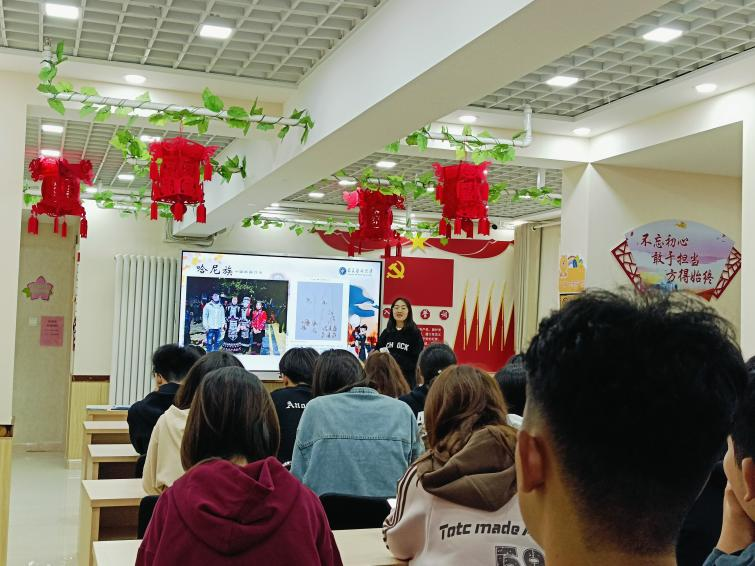活动开始,团支书魏晓倩向大家动情地分享了 “扎根雪域边陲的格桑花”的故事,以卓嘎央宗姐妹坚韧不拔的精神引导大家充分认识到各民族要像石榴籽一样团结在一起,坚持“家是玉麦,国是中国”的爱国信念。在民族知识大比拼环节,社区居民和同学们积极参与、踊跃抢答,现场氛围活跃又热烈。大家在放松的互动中,增强了对我国多个风格迥异、具有鲜明特色的民族知识的了解与认知。活动渐至尾声,宣传委员何小瑞向大家介绍了我国少数民族之一哈尼族的民族风俗和生活习惯,并通过哈尼族真实的生活影像,让大家对哈尼族的服饰、饮食习惯等方面有了更加深刻而全面的认识。