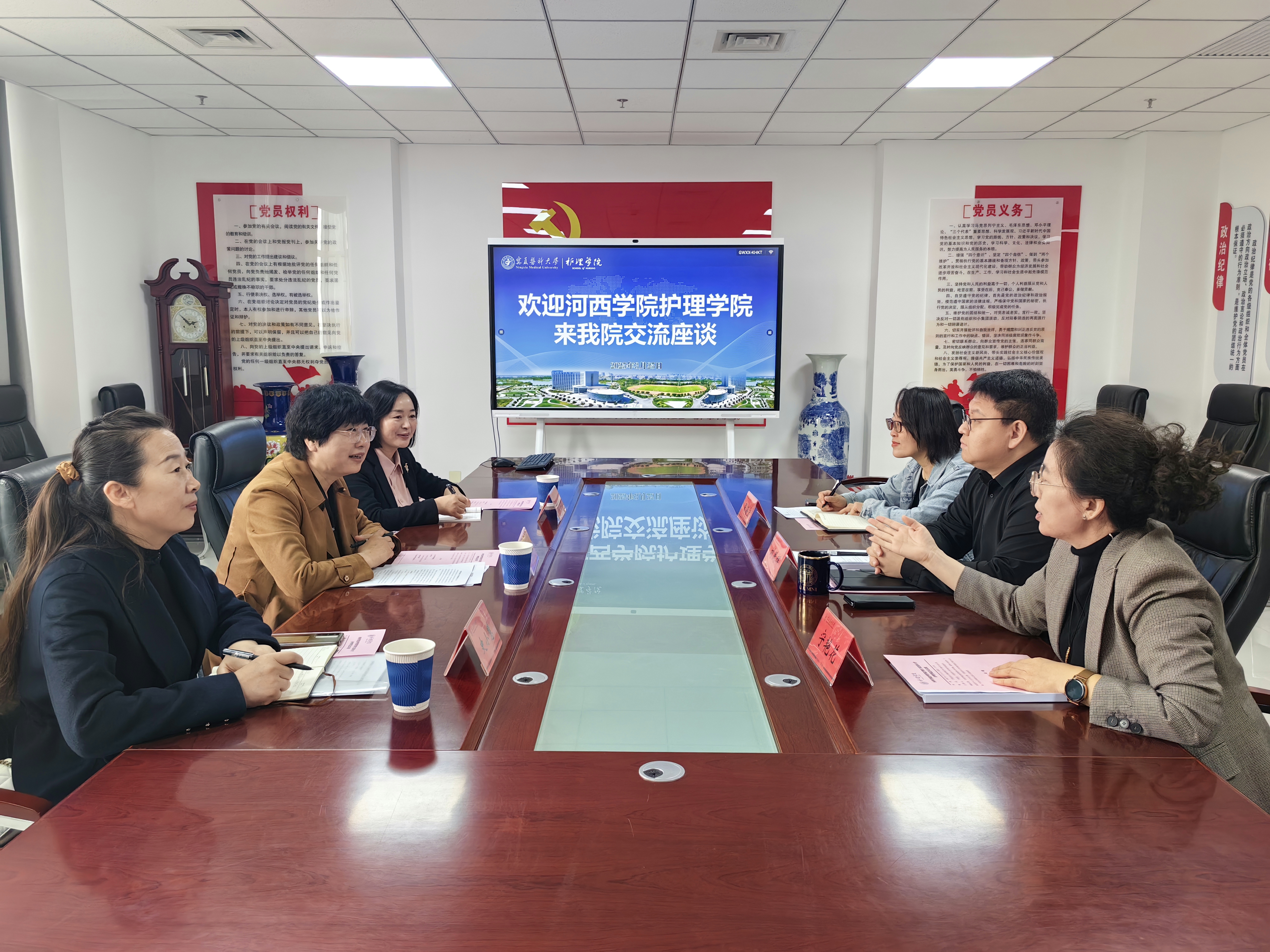 座谈会上,刘民辉代表学院对河西学院护理学院一行来访表示欢迎,并简要介绍了校院基本情况、发展历程和办学特色。田莉梅对河西学院护理学院的基本情况、办学历史、教育教学特色等进行了介绍。双方重点围绕护理学科建设、人才引进和护理学专硕研究生培养等细节进行了深入的交流探讨,表示要进一步推动两院合作,不断探索高等医学教育协同发展的新模式,共同推动两院高质量发展取得更大成效。