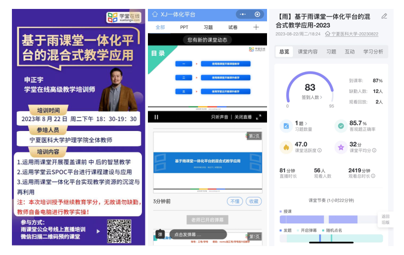本次线上培训,护理学院教师通过在混合式教学模式和多元化教学手段的切身体验中,为后续开展新的教学模式、多元化的教学手段开阔了教学思路。同时,也为促进学院教师深入探究智慧教学改革,主动探索智慧教学能力的提升发挥积极引导作用。