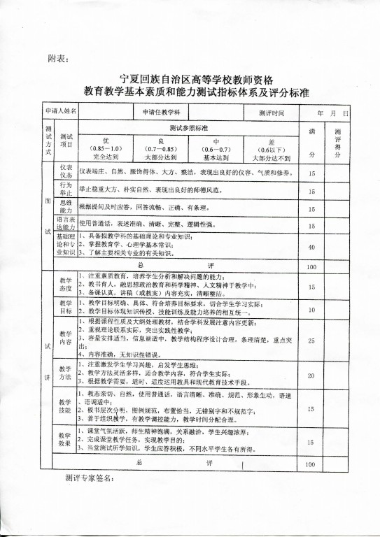 自治区高校教师资格教育教学基本素质和能力测试指标体系及评分标准
