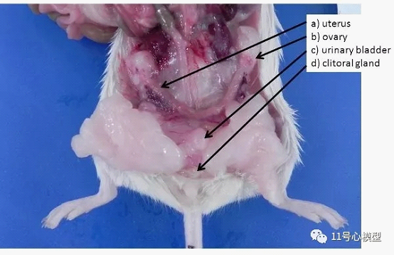 图4. 雌性生殖器官。 a)非妊娠子宫(小鼠和大鼠有双子宫角)b)卵巢,埋在卵巢脂肪垫中,c)膀胱,d)阴核腺。