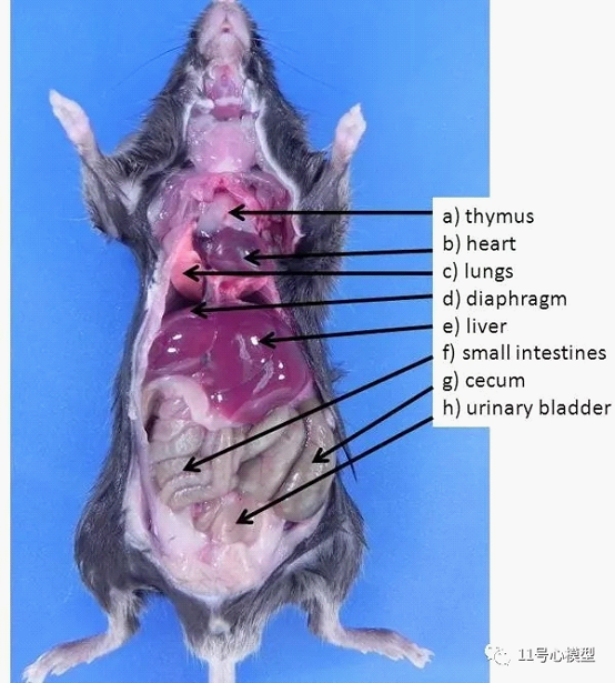 图1. 小鼠的腹部和胸部器官。a)胸腺,b)心脏,c)肺,d)横膈膜,e)肝脏,f)小肠,g)盲肠,h)膀胱。