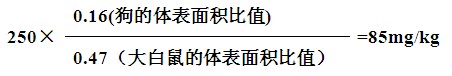 例:某利尿药大白鼠灌给药时的剂量为250mg/kg,试粗略估计狗灌胃给药时可以试用的剂量。