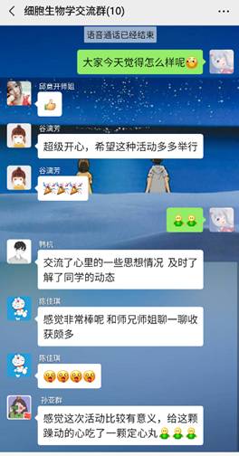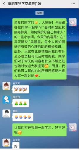 2019级细胞生物学专业李会霞同学于2018年获得心理咨询师三级资格证,至今担任校朋辈心理咨询师,此次心理疏导工作即由该同学组织。2020年2月21日星期五,在李会霞同学主持下,线上心理疏导工作于中午12:50在微信群里以视频的方式顺利举行,细胞生物学专业全体研究生参与此次活动。