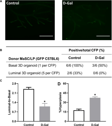 Stem cell self-renewal and differentiation in vivo was assessed by the cleared fat pad transplant assay as described previously [13]. In brief, 3D organoids from control and D-galactose-treated GFP C57BL/6 mice were injected into the contralateral inguinal glands of 21-day-old virgin wild-type female C57BL/6 mice cleared of endogenous epithelium. For basal stem cells, one single solid 3D organoid was injected into one cleared fat pad (CFP). For luminal progenitor cells, five hollow 3D organoids were injected into one CFP. A total of six CFPs were used for each type of 3D organoid per treatment group. Outgrowths, defined as epithelial structures with both ductal and lobular structures, were evaluated by Nikon fluorescence microscope after eight to ten weeks. The regenerated glands were further harvested for flow cytometry analysis of the luminal-to-basal cell ratio as well as histopathological analysis for hyperplastic lesions.
