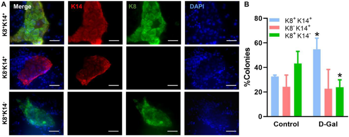 Figure 5. D-galactose alters luminal progenitor cell differentiation in vitro. (A) Representative immunofluorescence images showing distinct colonies formed by luminal progenitor cells on plates pre-seeded with irradiated NIH-3T3 fibroblasts; (B) Bar graph shows the distribution of different types of colonies formed by luminal progenitor from control and D-galactose-treated mice (> 20 colonies per animal × 3 animals). K14: basal cell marker keratin 14; K8: luminal cell marker keratin 8.