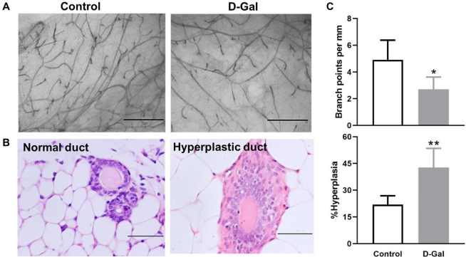 Figure 2. D-galactose affects mammary gland morphology and pathology. (A) Representative examples of whole mount carmine alum staining of mammary glands from control and D-galactose-treated mice (scale bars, 1 mm); (B) H&E histological images showing normal and hyperplastic ducts from control and D-galactose-treated mice (scale bars, 100 µm); (C) Quantification of branch points per millimeter (mm) duct (upper panel) and percent of hyperplastic ducts (lower panel) in control and D-galactose-treated mice (n = 5). Asterisks, significant difference between control and D-galactose (*P < .05, **P < .01).