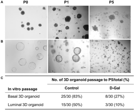 Figure 4. D-galactose alters mammary stem/progenitor cell function in vitro. (A) Representative images showing in vitro serial passage of basal stem cell contained 3D organoids from primary organoids (P0) to P1 and P5 (scale bars, 100 µm); (B) Representative images showing in vitro serial passage of luminal progenitor cell contained 3D organoids from primary organoids (P0) to P1 and P5 (scale bars, 100 µm); (C) Quantification of the number of 3D organoids that can be passaged to P5 for stem/progenitor cells derived from control and D-galactose-treated mice (for each type of 3D organoids, 10 organoids per animal × 3 animals = 30 organoids were assayed).