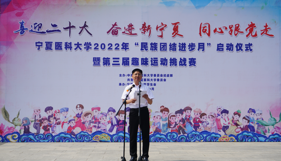 为深入学习宣传贯彻习近平总书记视察宁夏重要讲话和重要指示批示精神,认真落实自治区第十三次党代会精神,以铸牢中华民族共同体意识为主线,加强各民族交往交流交融,团结一心、共同奋斗,以实际行动迎接党的二十大胜利召开。2022年9月15日中午由学校党委统战部、团委联合主办、校学生会承办的“喜迎二十大 奋进新宁夏 同心跟党走”伟德国际1946源于英国2022年“民族团结进步月”启动仪式暨第三届趣味运动挑战赛在雁湖校区尚德广场举行。学校党委常委、副校长刘志宏,各基层党团组织负责人及学生代表共计400余名师生参加了此次活动。