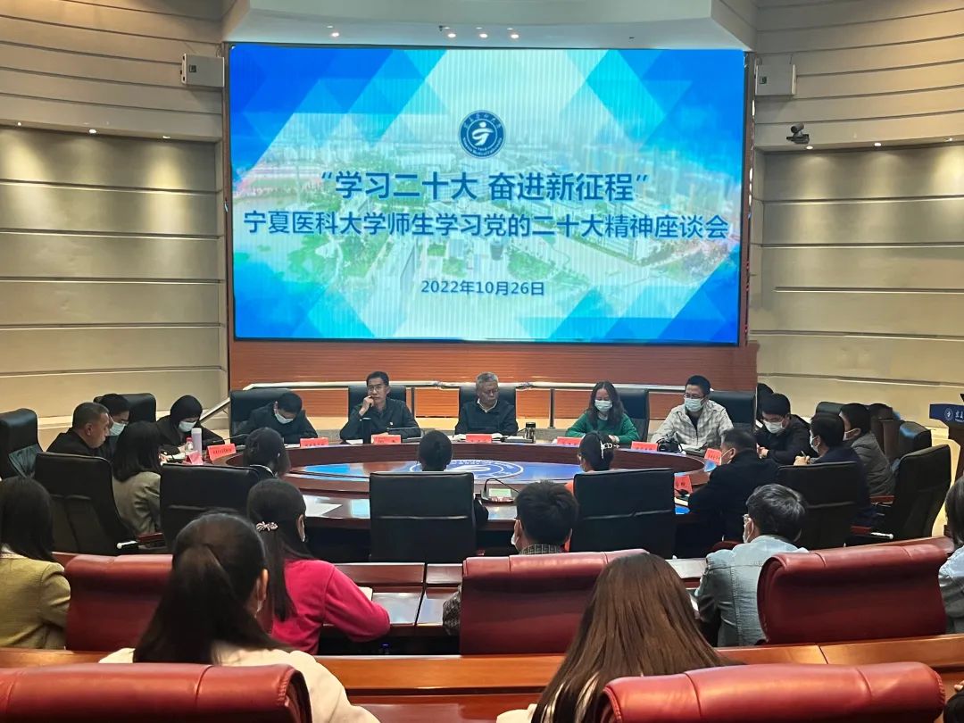 座谈会上,学校党委副书记从国内外新冠疫情形势、党的二十大的重要意义、如何学习贯彻党的二十大精神三个方面对广大师生提出希望和要求。一是当前国际形势复杂多变,全国疫情形势严峻复杂,宁夏自9月20日疫情发生以来,学校党委高度重视,全校师生上下万众一心,扎实做好疫情防控各项工作,坚决筑牢守护师生安全健康的防线,疫情正稳定向好发展,我们要不断强化自身专业能力,始终坚持人民至上、生命至上,为打赢疫情防控阻击战、推进健康中国建设贡献力量。二是中国共产党第二十次全国代表大会,是在全党全国各族人民迈上全面建设社会主义现代化国家新征程、向第二个百年奋斗目标进军的关键时刻召开的一次十分重要的大会,事关党和国家事业继往开来,事关中国特色社会主义前途命运,事关中华民族伟大复兴。三是习近平总书记提出的“五个牢牢把握”,为学习贯彻党的二十大精神提供了思想指引和重要遵循。我们要从深刻领悟对党和人民事业具有重大现实意义和深远历史意义的三件大事;深刻领悟党和国家事业取得的历史性成就、发生历史性变革;深刻领悟新时代十年的伟大变革具有的里程碑意义三个方面学习贯彻落实党的二十大精神,必须更加紧密地团结在以习近平同志为核心的党中央周围,自觉把思想和行动统一到党的二十大精神上来,深刻领悟“两个确立”决定性意义,更加坚定自觉做到“两个维护”,用心体会十年伟大变革,潜心感悟变革背后的科学指引,自信自强、守正创新,踔厉奋发、勇毅前行,在党的旗帜引领下奋力谱写宁医助推中华民族伟大复兴的崭新篇章。