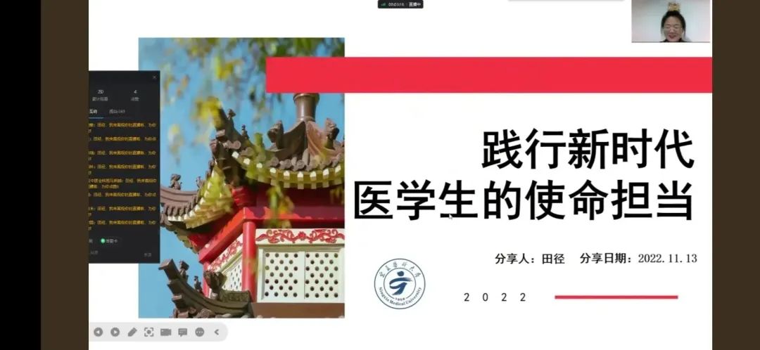 11月13日,伟德临床医学院2019级影像2班学生、2022年全国青年马克思主义者培养工程学员田径以“是什么”“为什么”“怎么做”为轴线,从“什么是新时代”“为什么要践行使命担当”“如何践行使命担当”三个方面,带领学员们深入学习了“如何践行新时代医学生使命担当”这一命题的深刻内涵。她寄语全体学员,作为医学生,应当在日常生活中深刻学习医学知识,扎实实践本领,树立终身学习的观念,培养科技创新能力和创造性思维能力,担负起现代医学知识创新、传播的重任,为实现中华民族伟大复兴添砖加瓦。