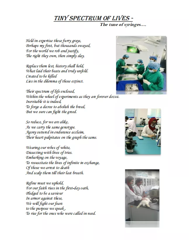 今年活动征稿作品除了诗歌类,还增加了漫画类。活动一经开展,就受到各学院学生的广泛关注和积极参与,一个月的时间共收到124份参赛作品,其中是诗歌类106份,漫画类18份。同学们在自己的诗歌作品中用凝练的语言、充沛的情感图文并茂地抒发对实验动物作用的认识和感受,对动物医学伦理原则的认知和理解;还有的用色彩丰富、构图精美、通俗易懂的漫画宣传展示实验动物伦理知识、人与实验动物及自然和谐共生等。比赛特别邀请了学校不同专业背景的专家教授担任评委,经综合评审,评选了一二三等奖及优秀奖。每类前5名获奖作品由学校推送继续参加中国病理生理学会主办的“我与实验动物的故事”征文活动。