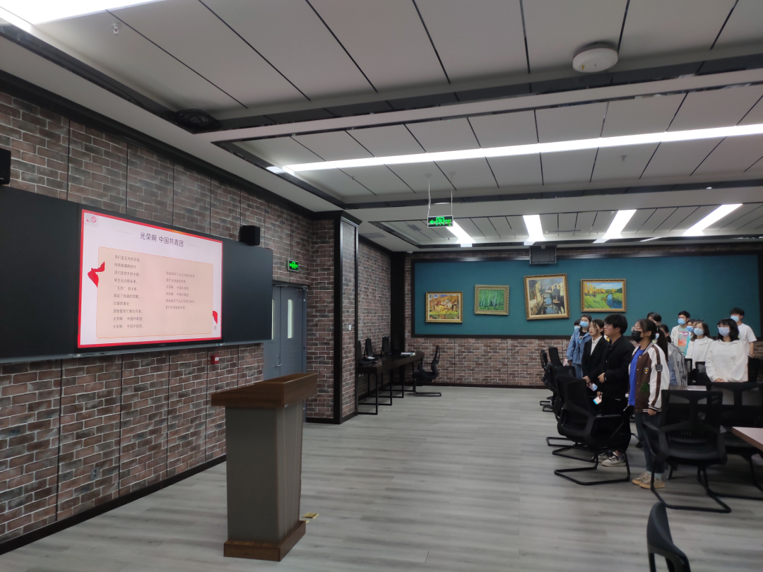 同学们一起了解团的旗帜、团的历史,并且进行共青团历史知识竞答,分享共青团榜样的故事,一起学唱《光荣啊 中国共青团》。