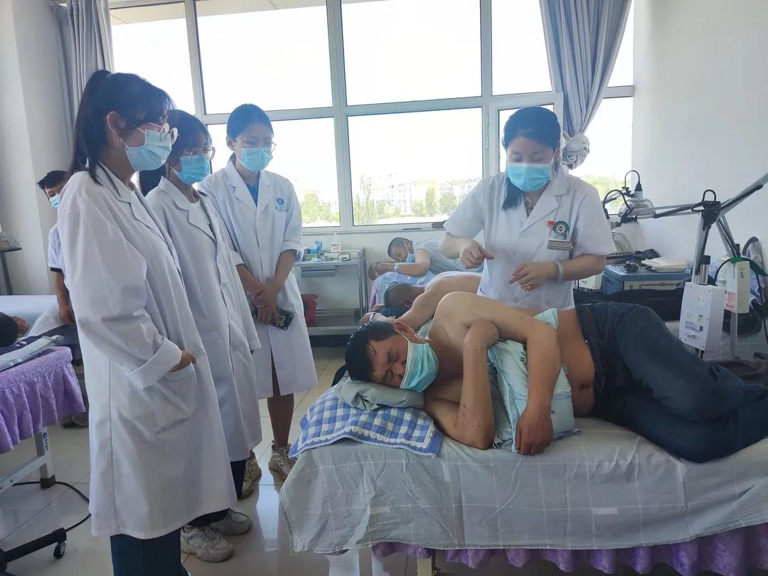 6月25日在郭斌老师的带领下到达医院,随后学生迅速被分配在针灸室、推拿室、门诊室,进入科室轮转见习,实地了解基层医疗现状。第二天义诊团集体前往贺兰县稻渔空间参加“美丽乡村集市”活动,体验乡村生活,感受社会主义新农村的风貌与成果。随后3天在初步认识了解医院情况后,跟随带教老师白帅等人开始跟诊学习,包括针灸、推拿、门诊以及微创治疗等。闲暇时老师们也给学生教授刮痧、拔罐以及针灸的相关知识,警示当下好好学习的重要性。活动的最后,学生们组织进行急救知识宣讲,包括心肺复苏及海姆立克急救法,同时也开展了太极拳和八段锦等养生功法的宣传与演练。