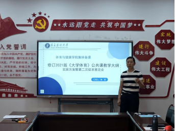 7月1日上午,体育与健康学院开展了修订《大学体育》(2021版)公共课教学大纲实施方案第二次征求意见会旨在贯彻“学生中心,产出导向,持续改进”理念,提高课程教学大纲修订质量和课程建设质量,切实发挥核心素养导向下的体育课程育人功能,持续推进体育教学质量内涵式发展。活动由基础教研室主任陈莹老师主讲,学院全体专兼职教师参加了本次教研活动