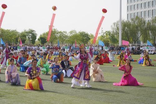 入场式上,伴随着雄壮激昂的运动员进行曲,国旗护卫队,校旗、校徽、彩旗队,各单位运动员代表方队依次入场,他们排着整齐的队伍,朝气蓬勃、昂首阔步、口号铿锵、意气风发地走在运动场上。在庄严的升国旗仪式中,全体师生员工肃立齐唱国歌,注视着五星红旗冉冉升起,每一道声音都是青春的宣言,汇聚着炽烈的力量。在方阵表演中,第一临床医学院学生带来的歌舞表演《青春至上》,以灵动的音符、曼妙的舞姿,彰显了宁医学子活力四射的青春之美;公共卫生学院学生在《青蓝之间》中演绎出生命旋律和运动之美;口腔医学院和检验学院学生在《石榴花开耀宁医》的欢乐乐曲中唱响各民族团结和谐之美,绘就出各民族像石榴籽一样紧紧抱在一起相亲相爱、团结进步的美好未来。