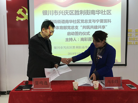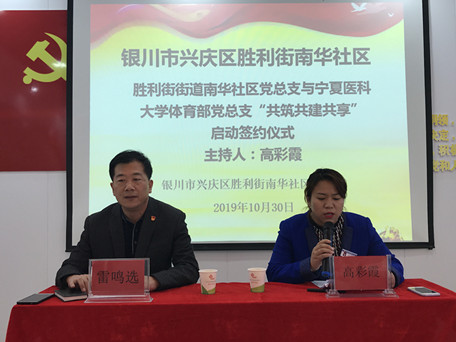 为了深入学习宣传贯彻党的十九大精神,坚持以习近平新时代中国特色社会主义思想为指导,落实新时代党的建设总要求,充分发挥基层党组织的主体作用,激发党员活力。10月30日下午,体育部党总支与银川市兴庆区胜利街南华社区党总支在南华社区服务站党员之家,开展以“党群共建大舞台,志愿服务暖人心”为主题的共筑共建共享活动启动仪式。体育部全体党员和南华社区的10名党员参加了此次活动。