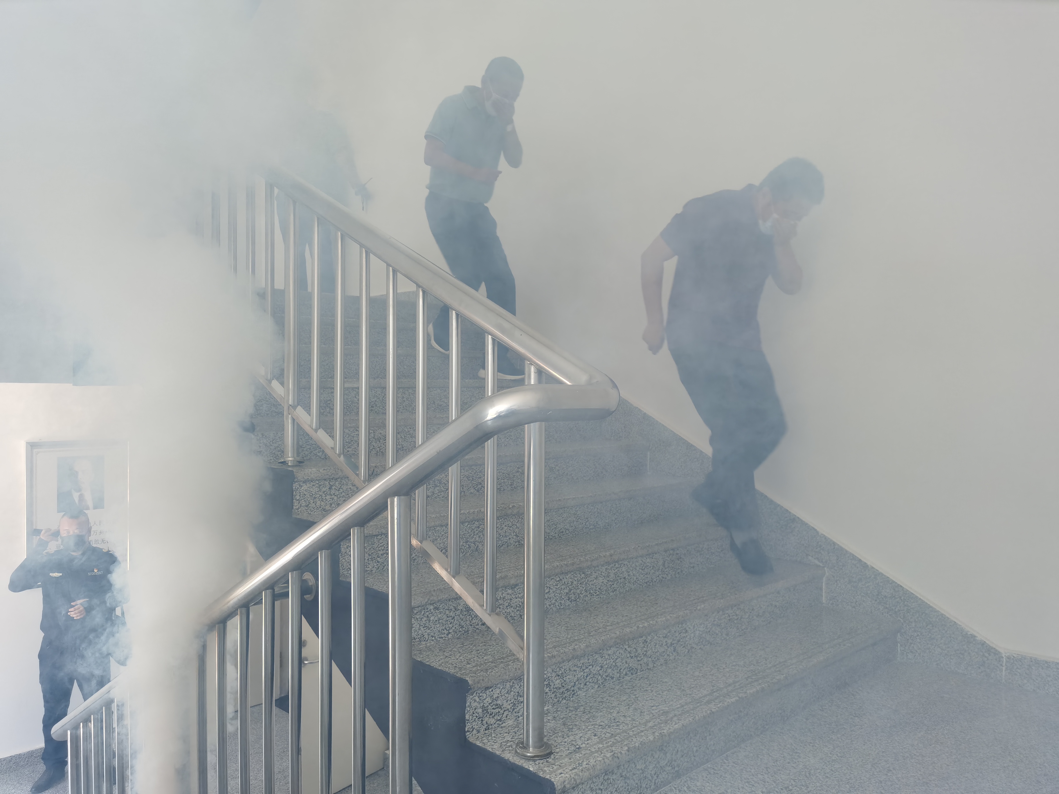 讲座结束后,体育部组织学生和老师共同参与了火灾逃生演练。