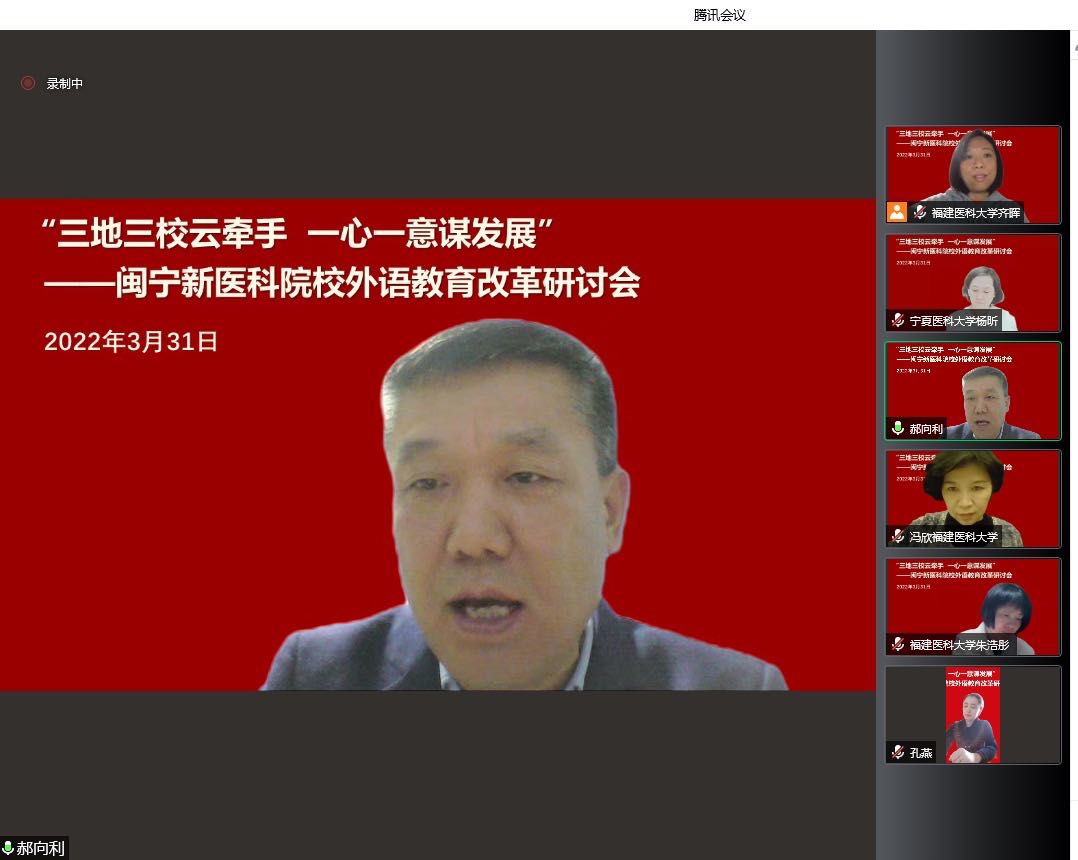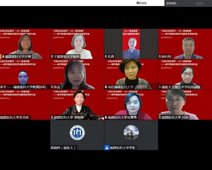 3月31日,外国语教学部主任郝向利、教学办主任杨昕与福建医科大学文理艺术学院、新疆医科大学语言与文化学院欢聚云端,共同参加闽宁新医科院校外语教育改革研讨会,探讨三校共建虚拟教研室的建设方案。