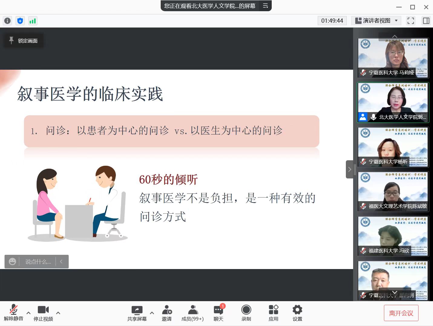 芳菲四月,草长莺飞。4月27日下午,外国语教学部全体教师与福建医科大学文理艺术学院、新疆医科大学语言文化学院教师迎来了闵宁新虚拟教研室成立以来的第一次联合师资培训。此次培训有幸请到“中国叙事医学第一人”--北京大学医学人文学院郭莉萍教授,从叙事医学的角度为三地教师的英语教学打开了新思路、提供了新可能。