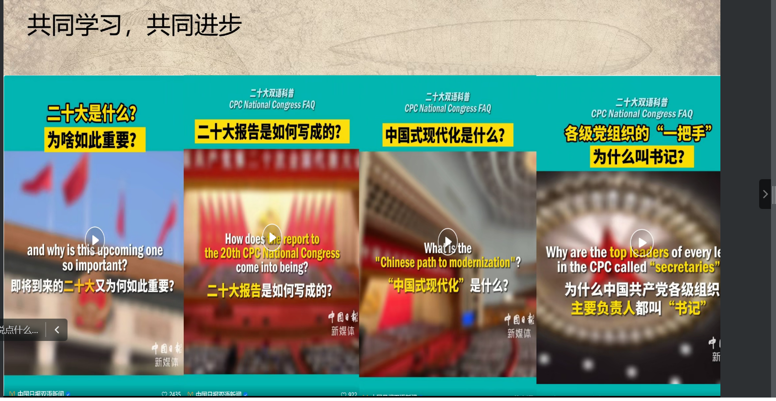会议伊始,教学组长王媛介绍了党的二十大的重要意义,作为高等教育工作者,如何将党的二十大精神有机融入大学英语教学是我们应肩负的责任与使命。教研室老师积极研讨,并分享授课体验。杨晓岗老师结合主备单元The Money Game,认为在新发展阶段,鼓励大学生把握机会,主动参与,敢于挑战,树立正确的金钱观与消费观。王玲娜老师通过课文内容的多角度讲解与深度剖析,引导学生思考,把党的二十大精神讲深、讲透、讲活。王媛老师向大家展示中英字幕小视频,如《美国共产党员:我来到了二十大现场》,激发学生们感悟党的二十大的兴趣。马合云老师通过《中国共产党国际宣传片》引导学生,“我是谁,我来自哪里?我要干什么?我要去哪里?”震撼心灵地阐释了我们的党苦难辉煌历程。李魁琴老师和张雪老师也通过备课微信群分享了资源平台、方法与感悟等。