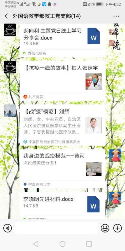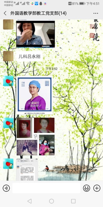 随后,每位党员分享了自己身边感人的抗疫事迹。既有身患“渐冻症”,妻子感染新冠肺炎,仍坚守奋战抗疫一线的铁人张定宇;逆行的英雄——宁夏援鄂的呼吸内科副主任医师夏岑峰;也有坚守岗位、一丝不苟的红寺堡区辅警“口罩脸”王海龙,平凡而可爱的群体——物业人;还有我们身边守护师生健康默默奉献的学校卫生所所长李晓明……他们中,有兄长、有姐妹、有同学、有闺蜜、有同事、有学生,在平凡的岗位上,他们展现着伟大。一个个鲜活的感人事迹,让讲述的老师声音哽咽了,眼眶湿润了!