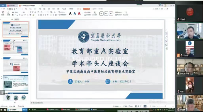 12月18日下午,宁夏区域高发病中医药防治教育部重点实验室召开学术带头人座谈会,会议通过线上线下相结合方式举行,重点实验室主任牛阳,宁医大总院消化科与呼吸科团队带头人、中医学院相关负责人、实验室全体教职工参加会议。会议由实验室常务副主任马英锋主持。