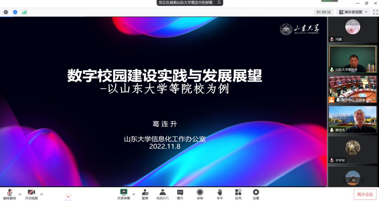 会议特邀山东大学葛连升教授担任主讲嘉宾。葛教授以“数字校园建设实践与发展展望”为主题,从教育数字化的认识及意义、数字校园规范解读、院校数字校园建设实践、数字校园发展展望四个方面及八个高校案例做全面、系统、内容丰富的讲解。