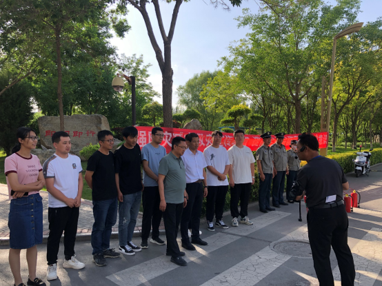 在室外灭火演练时,面对火情,保卫处杨俊康老师为全体员工现场演示干粉灭火器等消防器材的使用方法,现场全体员工还对灭火毯,消火栓及灭火器进行了操作演练。