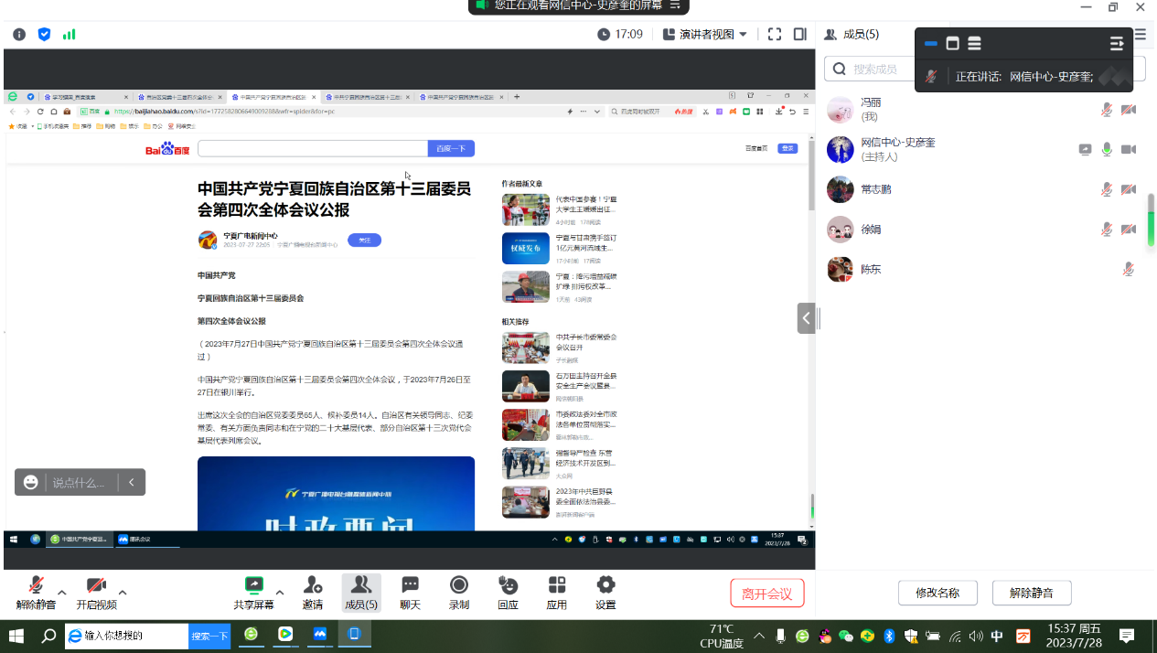 7月28日下午,网络信息中心组织召开线上专题会议,认真学习自治区党委十三届四次全会精神和,全面部署学习贯彻会议要求,史彦奎主任主持会议并传达学校相关会议精神和工作要求。全体人员参加会议。