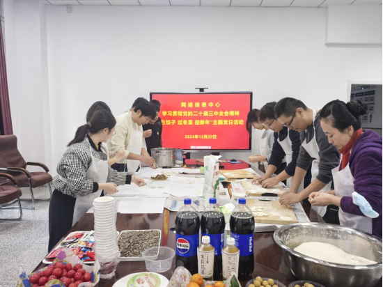 2024年12月20日,网络信息中心党支部在冬至来临之际,组织全体教职工和外包服务人员开展了“学习贯彻党的二十届三中全会精神 包饺子 过冬至 迎新年”主题党日活动。此次活动旨在深入学习贯彻党的二十届三中全会精神,同时通过传统节日的庆祝活动,增强党支部的凝聚力和团队精神,迎接新年的到来。