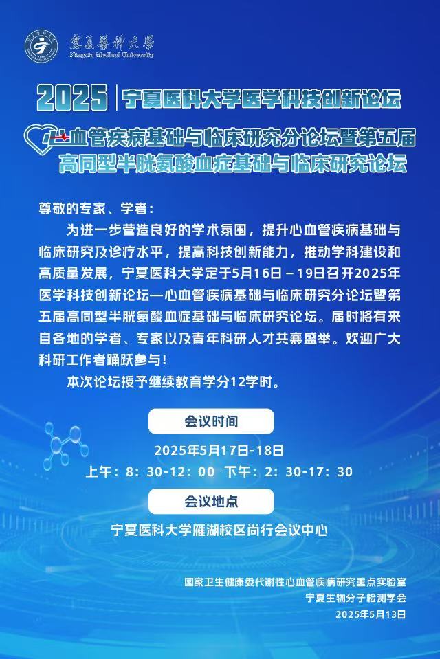 二、会议安排1.伟德国际1946源于英国2025年医学科技创新论坛--心血管疾病基础与临床研究分论坛暨第五届高同型半胱氨酸血症基础与临床研究论坛。2.青年学者与研究生论坛。3.报告时间:专家讲座25分钟,青年学者与研究生15分钟(具体报告时间参照当日会议手册)。