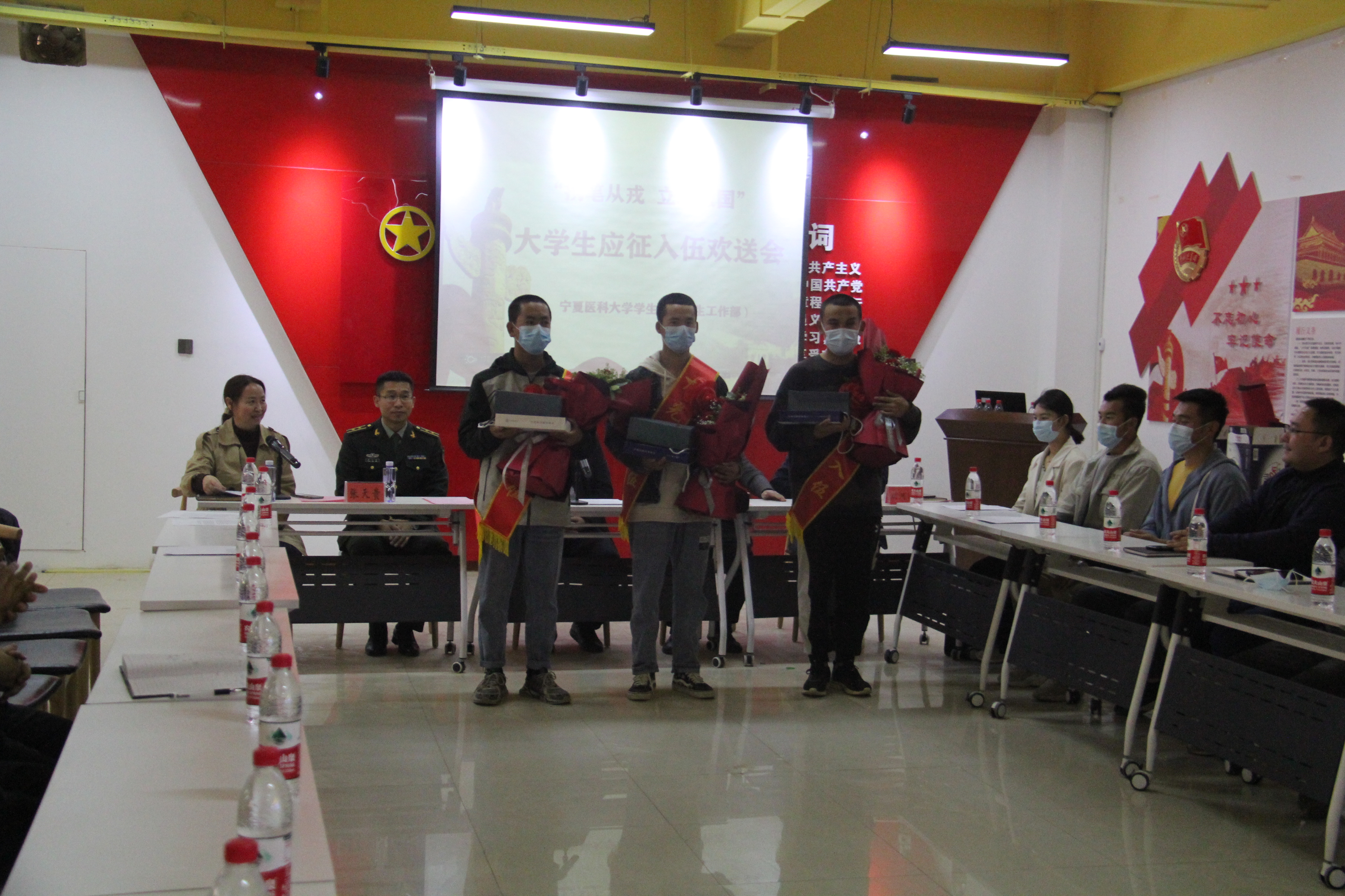 会上,与会领导向新入伍同学佩戴绶带并赠送献花和纪念品,表达了学校对新入伍同学的祝贺。