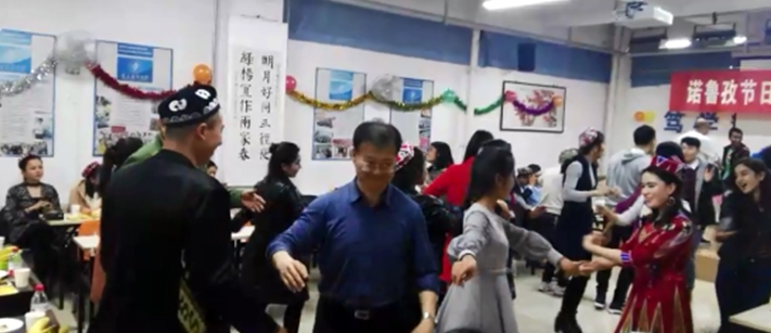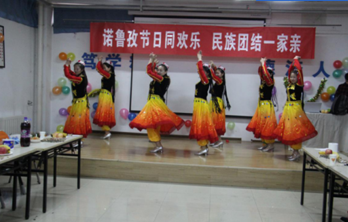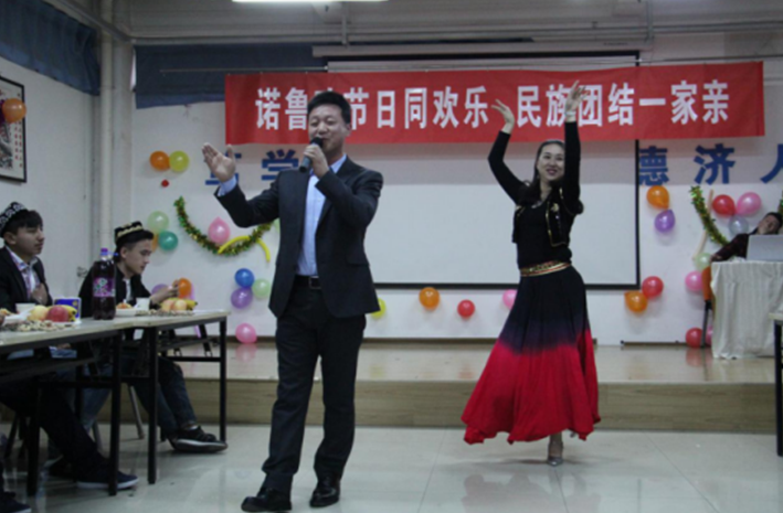 在大学生活动中心三楼学校免费为学生们准备了手抓饭等富有民族特色的风味美食,还有各种水果。同学们身着绚丽多彩的民族服装,随着音乐翩翩起舞,《纳吾肉孜歌》、《麦西来甫》等富有民族特色的传统舞蹈赢得大家的阵阵掌声和欢呼声,现场欢声笑语不断。临床医学院党委副书记王志凯老师的一首《在那遥远的地方》伴着苗苗老师婀娜多姿的舞步赢得了持久而热烈的掌声。